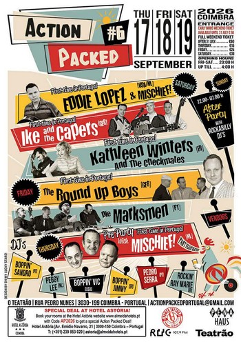 | 17. 18. 19. Sept. | COIMBRA (Portugal) | Action Packed 6 Jeudi. MISCHIEF Vend. THE ROUND UP BOYS , DIE MARKSEM Sam. KATHLEEN WINTERS & THE CHECKMATES , IKE & THE CAPERS , EDDIE LOPEZ FLYER | rock_n_roll rockabilly |