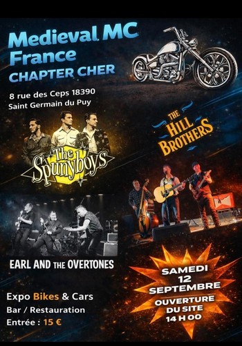 | Sam. 12. Sept. | SAINT GERMAIN DU PUY (18) Le Local;www.facebook.com/Médié 8 rue des Ceps Tel 06.30.15.34.51 / 06.09.80.10.54 | THE SPUNYBOYS , EARL & THE OVERTONES , THE HILL BROTHERS FLYER | rock_n_roll rockabilly |