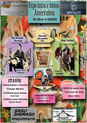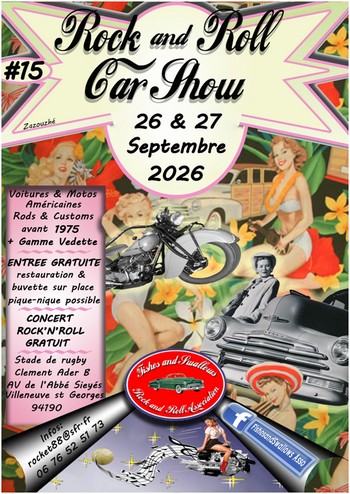 | 26. 27. Sept | VILLENEUVE SAINT GEORGES (94) Stade de Rugby Clément Ader B avenue de l'Abbé Sieyes Tel 06.76.52.51.73 | 15eme Rock'n'Roll Cars Show : concerts , expo voitures et motos americaines avant 1975 , rods et customs village vintage , brocante , stands , manège ancien , concerts Dim. THE BOPPIN STRINGS , GHOST HIGHWAY FLYER Programme | rock_n_roll rockabilly |