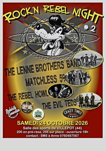 | Sam. 24. Oct. | VILLEPOT (44) salle des Sports Tel 07.60.48.75.67 | A partir de 18H : Rock' N Rebel Night 2 LENNE BROTHERS BAND , MATCHLESS 59 , THE REBEL'S HOWL , THE EVIL TEDS FLYER | rock_n_roll rockabilly |