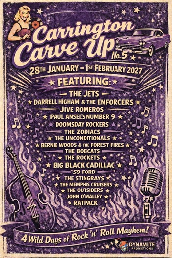 | 29. Janvier au 01. Février | BOURNEMOUTH (Angleterre) The Carrington Hotel Infos | Carrington Carve No 4 THE JETS , DARREL HIGHAM & THE ENFORCERS , JIVE ROMEROS , PAUL ANSEL'S NUMBER 9 , DOOMSDAY ROCKERS , THE ZODIACS , THE UNCONDITIONALS , BERNIE WOODS & THE FOREST FIRES , THE BOBCATS , THE ROCKETS , BIG BLACK CADILLAC , 59 FORD , THE STINGRAYS , THE MEMPHIS CRUISERS , THE OUTSIDERS , JOHN O' MALLEY , RATPACK FLYER | rock_n_roll rockabilly |