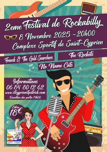 | Sam. 08. Nov. | SAINT CYPRIEN (42) Complexe Sportif Tel 06.84.80.12.62 Infos  | 2eme Festival de Rockabilly FRANCK COMTET & THE GOLD SEARCHERS , THE ROCKETS , NO NAME CATS FLYER  | rock_n_roll rockabilly  |
