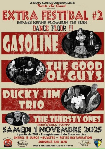 | Sam. 01. Nov. | PLOMELIN (29) Espace Kerne 20 VC Ménez Cloeder Tel 06.13.67.90.31  | Extra Festi'Bal 2 DUCKY JIM TRIO , GASOLINE , THE GOOD OL GUYS , THE THIRSTY ONES FLYER  | rock_n_roll rockabilly  |