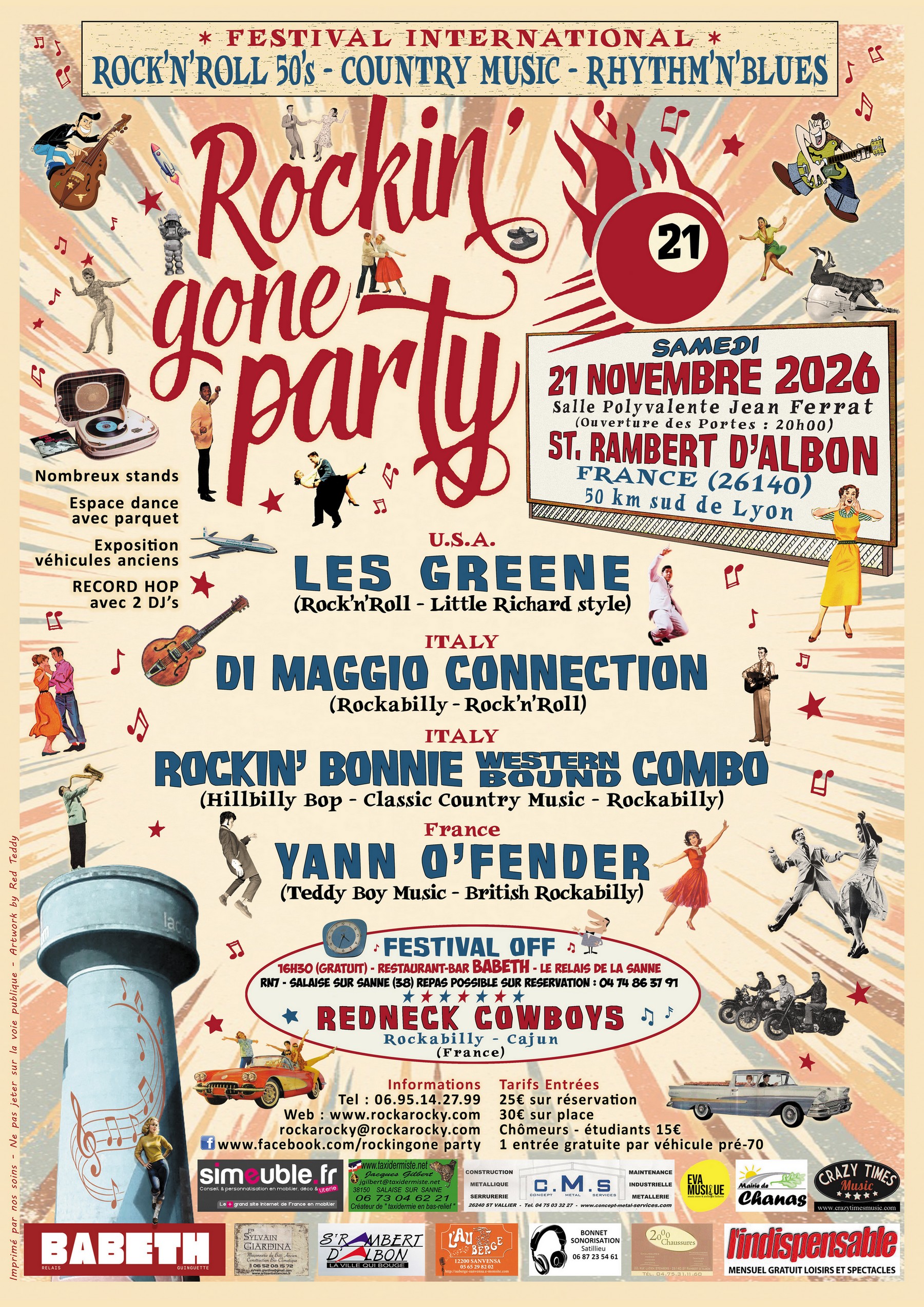 | Sam. 21. Nov. | SAINT RAMBERT D'ALBON (26) (50 km au sud de Lyon à 2 km de la sortie Chanas de l'autoroute A7) Tel 06.95.14.27.99 Page Facebook Email pour demande de stand | Les associations RockaRocky.com et Rock' In Rambertois présentent : The Rockin Gône Party # 21 Festival International de Rock'n'roll , rockabilly et musiques américaines des années 50 LES GREENE (USA) ![]() Vidéo 1 Les Greene Vidéo 2 Les Greene Vidéo 3 Les Greene DI MAGGIO CONNECTION (Italie) ![]() Vidéo 1 Di Maggio Connection Vidéo 2 Di Maggio Connection Vidéo 3 Di Maggio Connection ROCKIN' BONNIE WESTERN BOUND COMBO (Italie) ![]() Vidéo 1 Rockin' Bonnie wbc Vidéo 2 Rockin' Bonnie wbc Vidéo 3 Rockin' Bonnie wbc YANN O' FENDER (France) ![]() Vidéo 1 Yann O' Fender Vidéo 2 Yann O' Fender Vidéo 3 Yann O' Fender Festival Off au bar restaurant Babeth Le Relais de la Sanne (à Salaise sur Sanne) REDNECK COWBOYS (France) ![]() Vidéo 1 Redneck Cowboys Vidéo 2 Redneck Cowboys Entrée gratuite Repas possible après le concert uniquement sur réservation auprès du Relais de La Sanne au 04.74.86.37.91 Itinéraire Relais de La Sanne à St Rambert D’Albon HEBERGEMENTS Liste_Hôtels Hébergements Hôtels , Gites , chambre d’Hôtes Autres infos hébergement office du tourisme | rockabilly rhythm_n_blues rock_n_roll country_music western_swing blues blues cajun gospel |