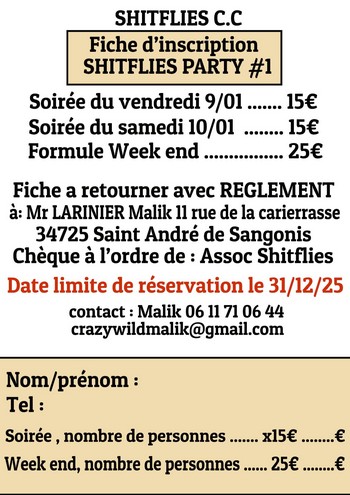 | 09. 10. Janvier | CAMPAGNAN (34) Rue de La gare  | Shitflies Party 1 Vend. THE BOP ROCKERS , BARNY & THE RHYTHM ALL STARS Sam. REDNECK COWBOYS , THE ROCKHOUSE TRIO , THE H BOMBS FLYER Résa  | rock_n_roll rockabilly  |