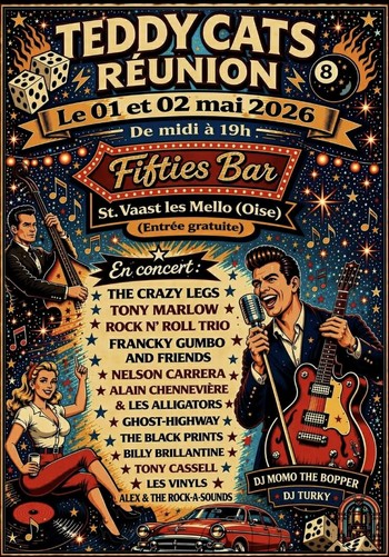 | 01. 02. Mai. | SAINT VAAST LES MELLO (60) Le Fifties 351 rue de la Commune de Paris Tel 06.35.78.22.02 | Teddy Cats Reunion THE CRAZY LEGS , TONY MARLOW ROCK N' ROLL TRIO , FRANKY GUMBO AND FRIENDS , NELSON CARRERA , ALAIN CHENNEVIÈRE ET LES ALLIGATORS , GHOST HIGHWAY , THE BLACK PRINTS , ALEX AND THE ROCK A SOUND , BILLY BRILLANTINE , TONY CASSELL , LES VINYLS FLYER | rock_n_roll rockabilly |